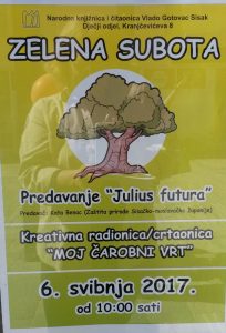 Javna ustanova se uključila u radionicu Dječjeg odjela Narodne knjižnice i čitaonice Vlado Gotovac iz Siska s čitanjem slikovnice “Žirkova priča” originalnog teksta autorice Ive Dužić koja je opisala život jednog posebnog hrata spomenika prirode. Ova priča ujedno govori i o projektu Ustanove “Julius futura” koji ima za cilj očuvanje genoma hrasta lužnjaka spomenika prirode koji je stradao u oluji 2014. godine, ali su njegovi geni ostali očvani zahvaljujući ovom projektu jer su uspješno uzgojene sadnice-klonovi ovog hrasta. Zahvaljujući ovom projektu u proljeće 2015. godine posađen je prvi klon Juliusa kojeg mi zovemo Žirko! Tako je uspješno povezana priča o očuvanju iznimnog stabla kroz život njegovog potomka identične genetske strukture. Čitanje slikovnice Žirkova priča, koja je ilustrirana radovima djece iz vrtića Sisak Stari i pravi je nastavak priče o starom-mladom stablu koja setreba ispričati novim generacijama mladih.